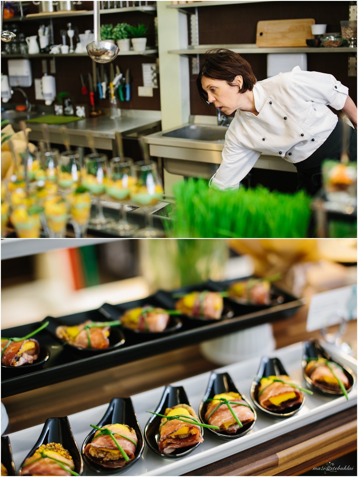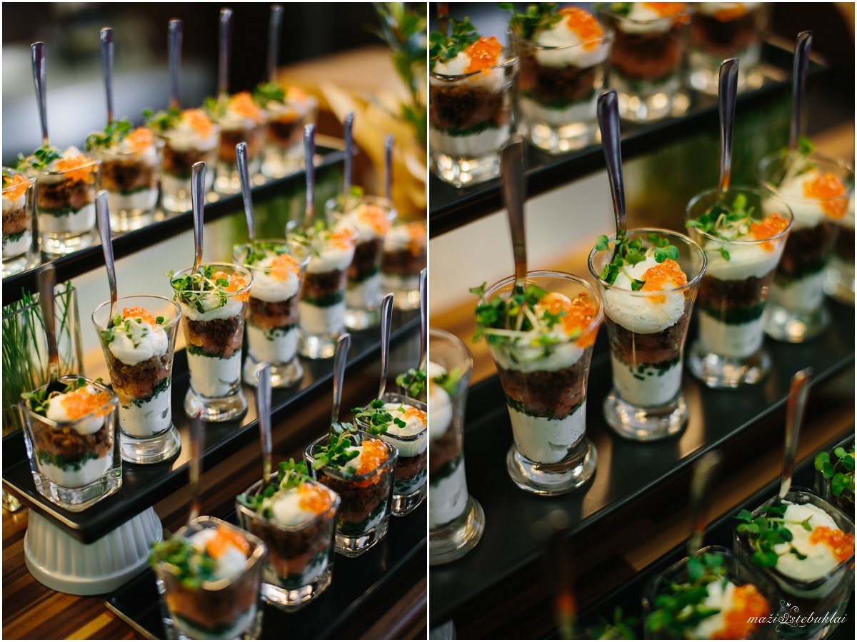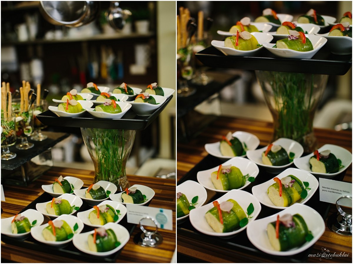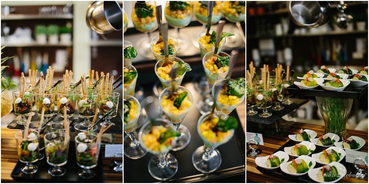 Spalvų ir skonių deriniai švelniai susiliejo mano vaizduotėje, sproginėjančiais spalvingais ratilais. Buvo labai gardu, paragavau tikrai nemažai įvairiausių užkandžių ir kelis saldumynus. Labai patiko mango kąsnelis su vytintu kumpiu, auksinė salsa su vištienos kremu ir saldžiais kukurūzais. Kadangi nesu labai didelė žuvies gerbėja labai maloniai nustebino menkės kremas su žaliojo poro marškinėliais, jis buvo švelnus kaip šilkas. Skirtingi užkandžiai atskleidė įvairius skonius: nuo gaivių, lengvai pagardintų žalio aliejaus ir balto vyno padažu, salotų iki sluoksniuotos duonos užtepėlių torto ar net mini burgerių. Namo iškeliavau su burnoje tango šokančia šokolado ir aviečių panna cota. Buvo smagu, gražu ir labai skanu. Pagyrimai puikiai komandai:)