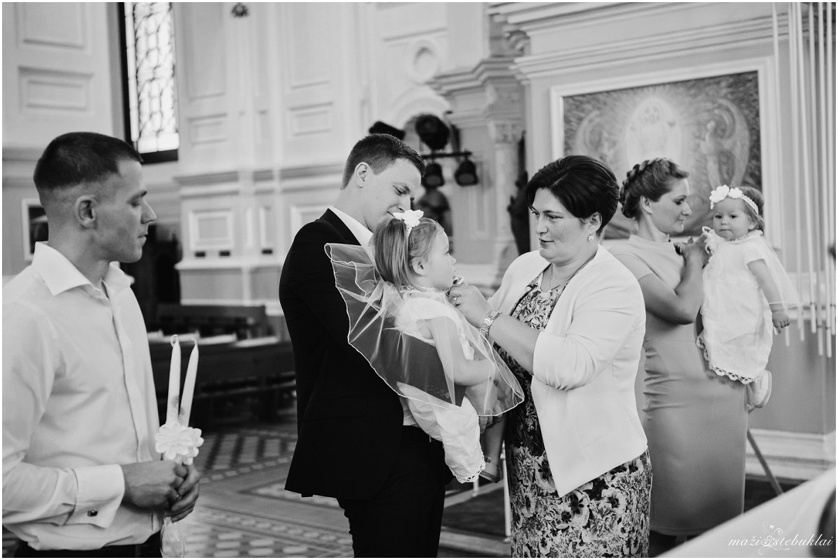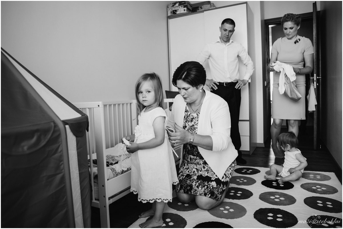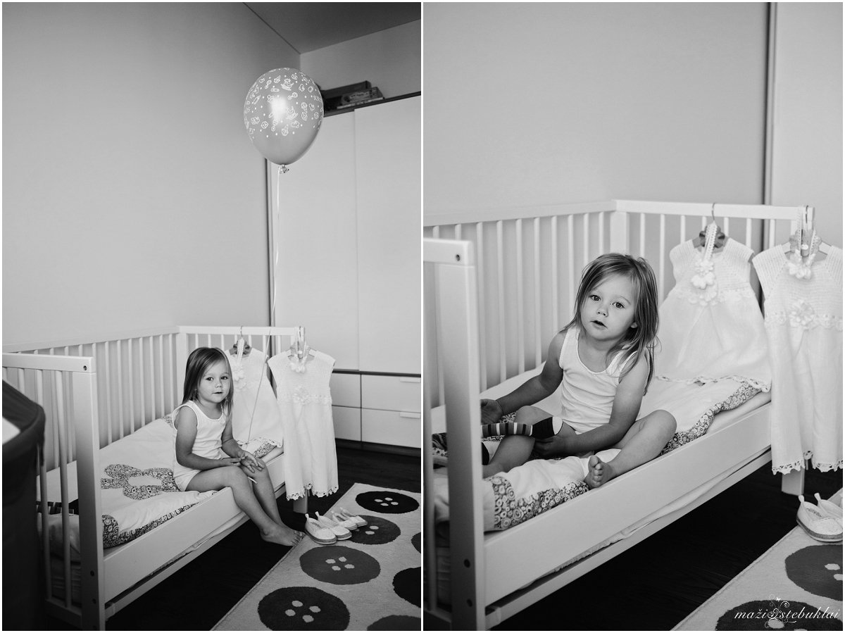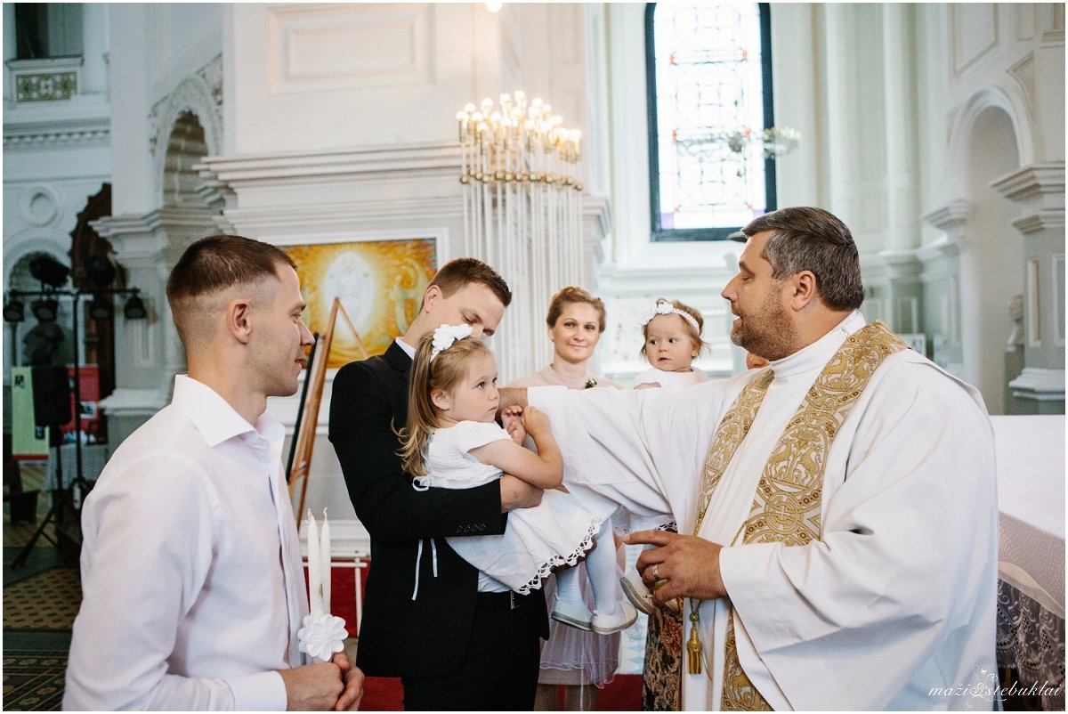 Atvykus į dviejų sesučių namus, mane pasitiko Dominyka ir Augustė. Mergaites aprangę tėveliai su krikšto tėveliais išskubėjo krikšto ceremonijai, kuri vyko Kauno Šv. arkangelo Mykolo (Įgulos) bažnyčioje. Po ceremonijos tėveliai su svečiais vyko į Raudondvario dvarą.